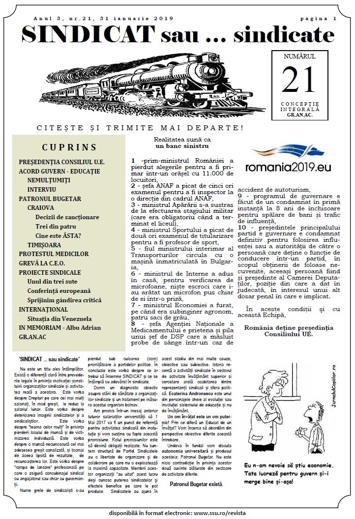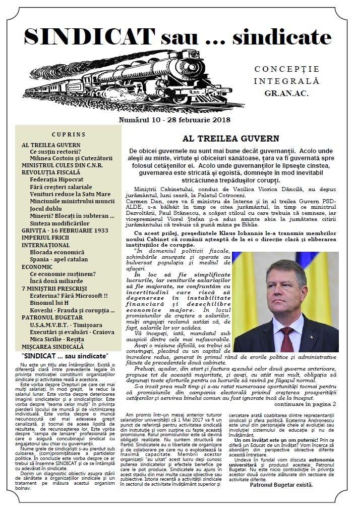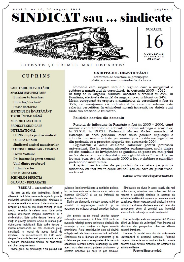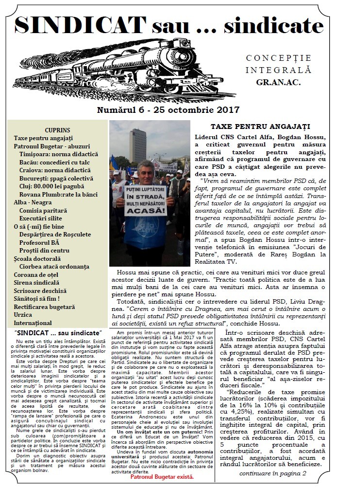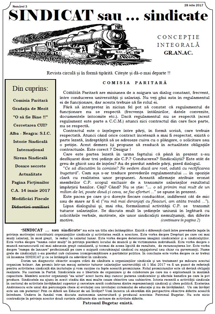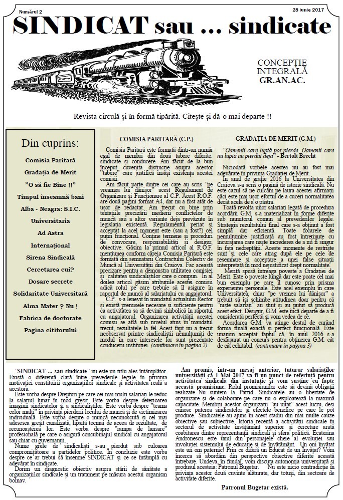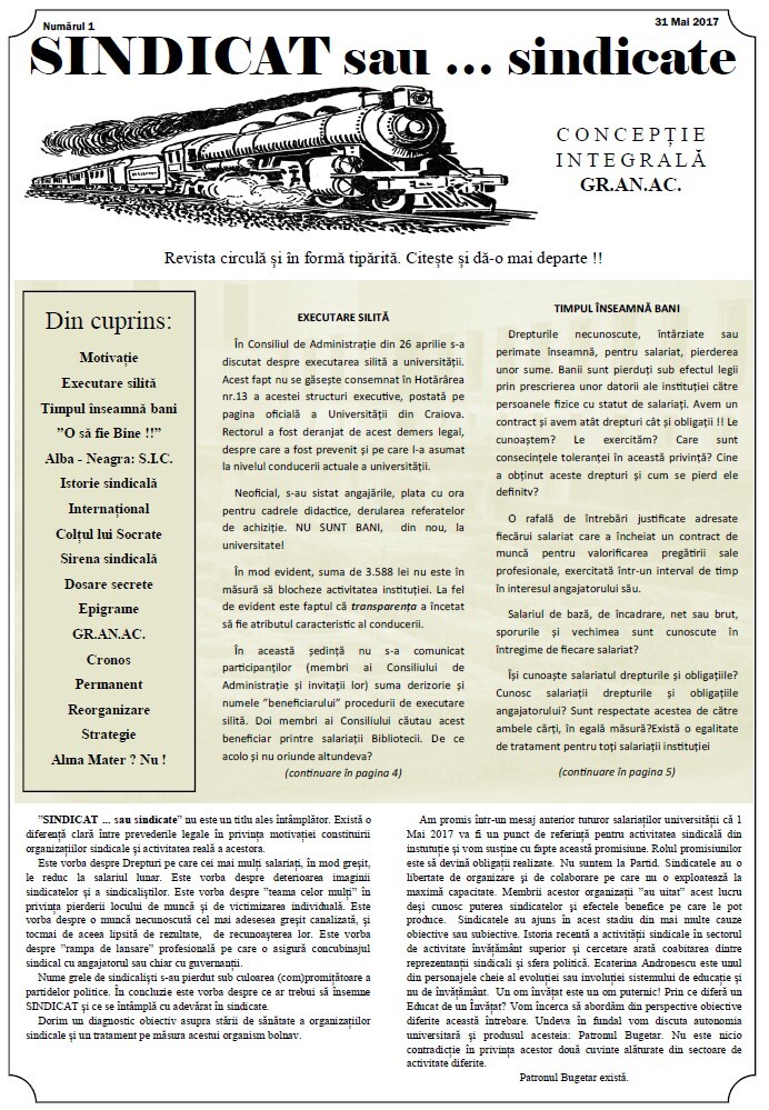 ”SINDICAT ... sau sindicate” este un instrument pe care S.S.U., cu sprijinul GR.AN.AC. (GRup de ANaliză și ACțiune) îl folosește pentru a informa, critica sau promova idei, tendințe sau acțiuni desfășurate în cadrul universității craiovene. Obiectivul pe care îl urmărim este acela de a redacta și de a transmite un buletin informativ sindical, în mod regulat, către toți salariații, în aceeași zi și în același timp.