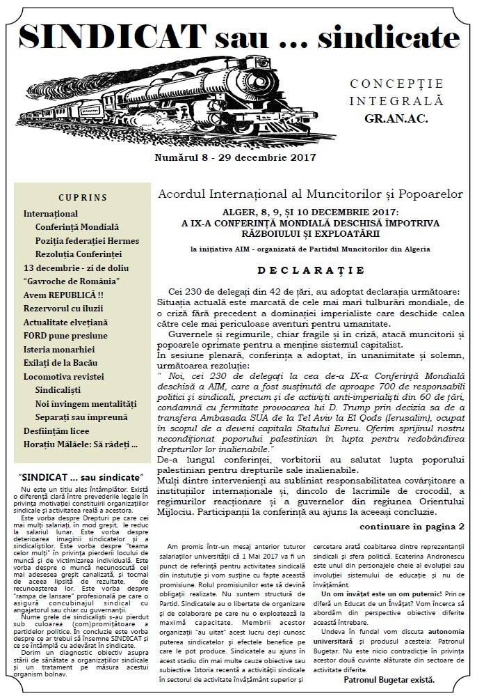 Holocaustul Țiganilor, Gheorghe Piperea (soluții pentru deficitul bugetar, despre C.A.S. și C.A.S.S.), Andrei Silviu (ne aflăm în mijlocul unui conflict social), HARUKNU NISHIMATSU (Japan Airlines), Statul contra națiunii, Federația Sindicală Hermes (debandadă managerială și financiară la MEC-ANC), EXPERIMENTE MILITARE AMERICANE (6 AUGUST 1945, bomba atomică cu uraniu lansată asupra orașului HIROSHIMA, 9 AUGUST 1945, Bomba atomică cu plutoniu lansată asupra orașului NAGASAKI), Kim Ung-Yong ( Nu e nimic acolo. E pustiu. Întoarceți-vă la lucruri simple), Primele zece firme cu datorii de miliarde de lei la stat, Bazele unei societăți echitabile, în care muncitorii să nu fie simpli executanți, Anarho-sindicalism, REFORMA (nu înseamnă să tai de la cei săraci și să dai la cei privilegiați), MIHAI FÂRTAT - Aisbergul educației, DANIEL DAVID -Ministrul EPUIZAȚIEI naționale, ANA IPĂTESCU (femeia care a aprins flacăra revoluției), Huang Yanzhe (bunica de 76 de ani și calul de fier), Information Ouvriere ( vremuri grele pentru ”Macronie”), Apel internațional ("NICI UN BAN, NICI O ARMĂ, NICI O VIAȚĂ PENTRU RĂZBOI!")