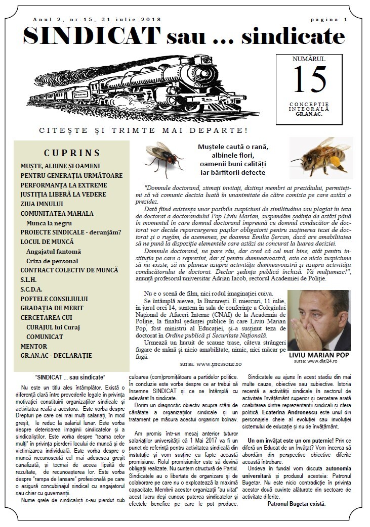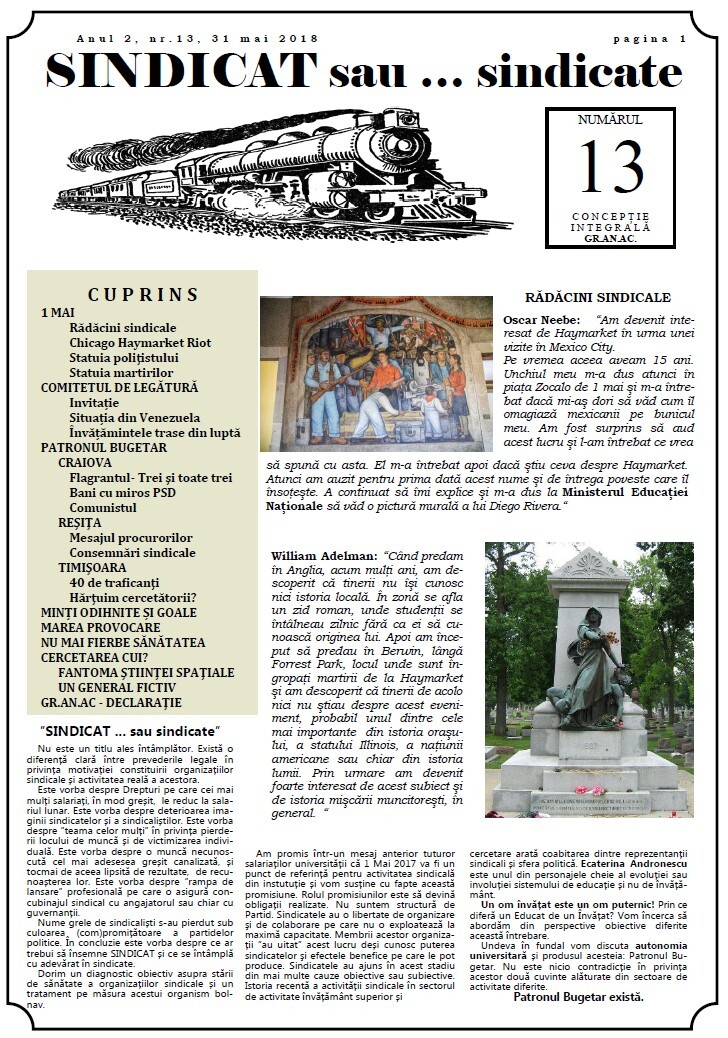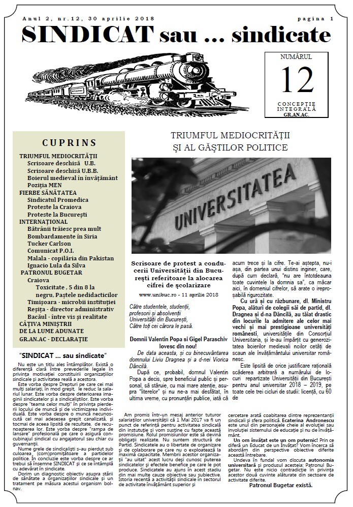 1 MAI - Ziua solidarității internaționale a muncitorilor, Cezar Ionuț Spînu - Rector Univ. din Craiova (calitatea de candidat la alegeri contestată în instanță), Solidaritate Universitară - petiție către Primul ministru, Decorații aurite ( morminte gratuite, groapa comună bugetară, nici moartea nu îi desparte), Ramona Lile taie panglici, Școala Națională de Studii Politice și Administrative - cu NATO prin universități, Universitatea Vieții din Timișoara ( Klaus Iohannis împotriva hectarelor, Alegerile sunt ale Rectorului CeAPe?), MOȘTENIREA lui Sorin Câmpeanu (legi dedicate protejării plagiatorilor, cui ”servesc” Legile lui Câmpeanu?, tunuri cu terenurile școlilor, Lidia Bodea despre plagiatul lui Câmpeanu), Legea salarizării se negociază la Bruxell, CILE - Apel împotriva războiului, GERMANIA - complicitate la genocid?, Legea Sistemului Național de management a situațiilor de criză, ALGERIA - Partidul Muncitorilor, GR.An.AC - Grupul de Analiză și Acțiune